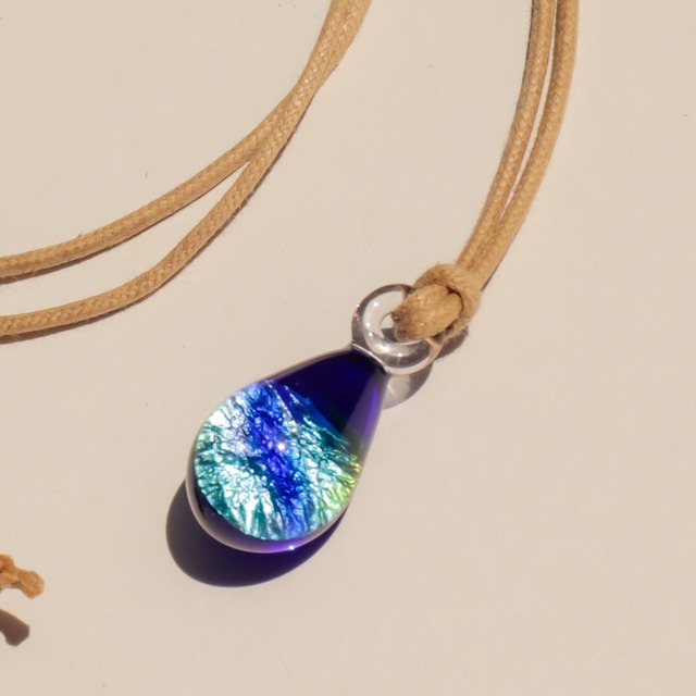 まだ言葉になる前の感情が、 深いところで静かに沈んでいるような色。 揺れようとしないわけでも、 強くあろうとするわけでもなく、 ただそこに在る、湖の水面のような静けさを映しています。 澄んでいて、冷たすぎず、 どこまでも奥行きがあるのに、 騒がしさはひとつもない。 見る人の心が少し静まったとき、 その奥にそっと重なるような一滴です。 この雫は、 首元でそっと揺れる コットン紐のネックレス。 日々の装いに溶け込みながら、 ふとした瞬間に、 静かな記憶を呼び起こします。 【紐/チェーンの選択について】 ・コットン紐 軽くてカジュアル。 普段使いに、気負わず 身につけていただけます。 ・チェーン 華やかで上品な印象。 装いを少し整えたい日や、 フォーマルな場にもおすすめです。 もう少し華やかな雰囲気がお好みの場合は、 チェーンタイプもご用意しています。 ↓ 迷ったときは、今の自分に いちばん静かに寄り添うものを 選んでみてください。 はじめての方には、 服装を選ばず使いやすい コットン紐を選ばれる方が多いです。 【サイズ・仕様】 長さ:約70cm (ウッドビーズで長さ調整が可能です) 重さ:約6g ガラス部分 ・長さ:約2cm ・厚み:約1cm 【お届けについて】 作品は、本のように開く 特製ボックスにお入れしてお届けします。 開いた瞬間に、小さな物語が静かに 始まるような仕様で、 ご自身への贈り物としても、 大切な方への贈り物としても お選びいただいています。 【発送について】 ご注文をいただいてから、 一点ずつ仕上げ・検品を行っています。 発送までのお時間については、 ABOUTページ「お届けについて」にまとめています。 お手すきの際にご覧ください。 【シリーズについて】 『群青』シリーズのひとつです。 同シリーズの ピアス・イヤリングも出品しています。 気になるものがありましたら、 ゆっくりご覧ください。 ピアス・イヤリング https://shop.todomeya-glassaccessory.com/items/102521684 【ご案内】 ※一点ずつ手作業で制作しているため、 ガラスの色味や気泡の入り方に わずかな個体差があります。 それぞれが、 世界にひとつだけの表情を持った雫です。